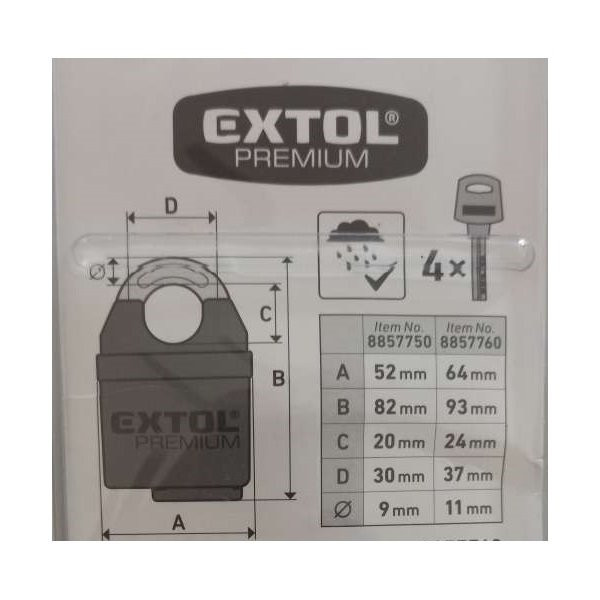 EXTOL 8857750 Biztonsági lakat, levágás elleni védelemmel, festett, vízálló, 4db kulcs; 50mm