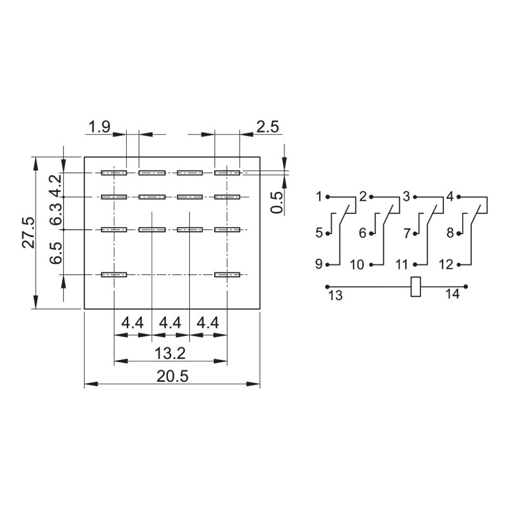 A relé négy váltóérintkezős (4×CO) kialakítása lehetővé teszi több független áramkör egyidejű kapcsolását. Ez különösen hasznos gépvezérlésekben, elosztószekrényekben, valamint olyan automatizálási feladatoknál, ahol több jel vagy fogyasztó logikus vezérlése szükséges.